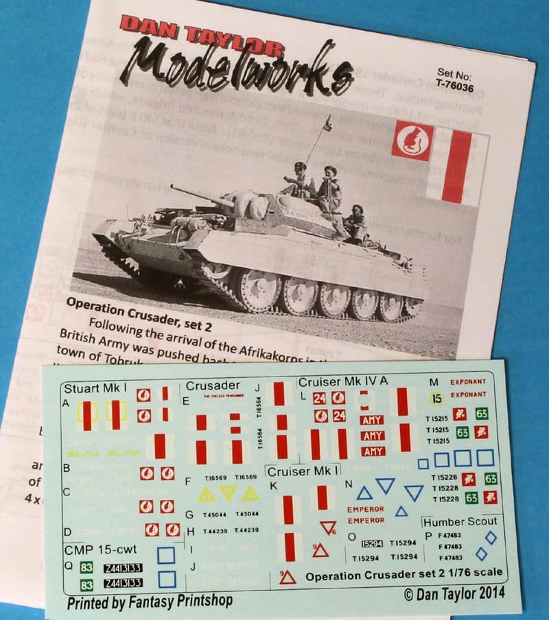 Inside this set you have markings for 1 x Stuart Mk I (M3), 6 x Crusader Mk I/II, 1 x Cruiser Mk I (A9), 4 x Cruiser Mk IV A, 1 x Daimler Scout, 1 x CMP 15-cwt.